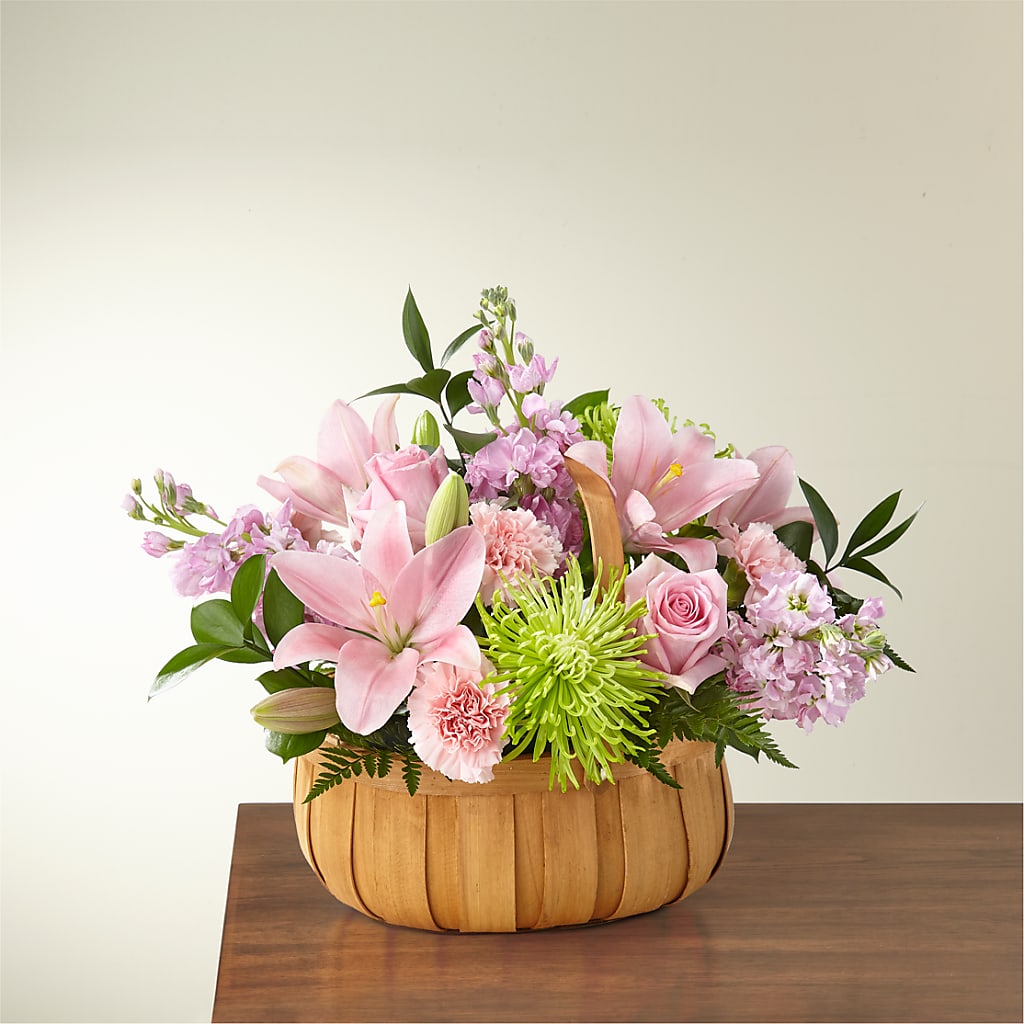 Let them know how much you care with a gorgeous bouquet that features carnations, stock, roses, lilies and Fuji mums. Each bloom is a thoughtful reminder of your support and love, while sitting in a beautifully crafted basket.