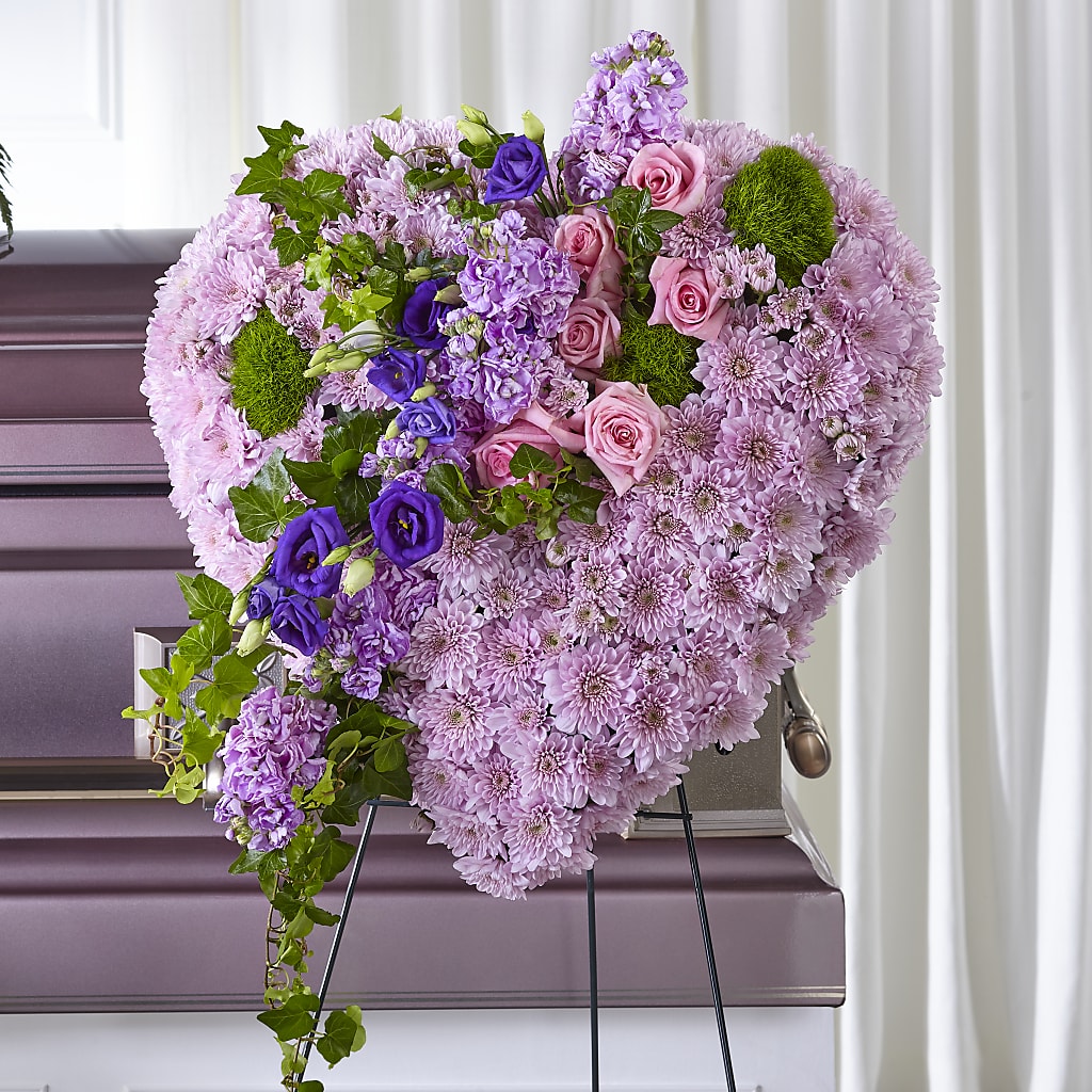 For those who you will always hold close to your heart, share your sympathies with our Treasured Love Standing Heart. This beautiful display is a thoughtful take on a traditional heart and is crafted with cushion pompons, roses, lisianthus and stock